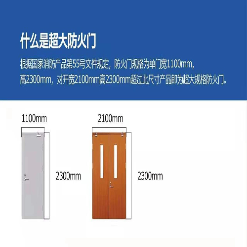 超大尺寸防火門是根據消防產品55號文件規定:防火門單門寬1100mm,高度2300mm;對開寬2100mm,高度2300mm。超過此尺寸產品,稱為超大尺寸防火門。