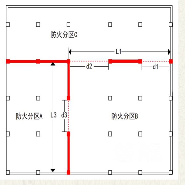 如上圖所示不管2個相鄰防火分區之間分隔的形狀如何,其分隔部分寬度均為所有距離相加,即L1和L2相加,其防火卷簾寬度也是d2和d1相加計算后滿足規范要求。