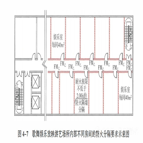 4.3.7 歌舞娛樂放映游藝場所的布置和分隔應符合下列規(guī)定:3 房間之間應采用耐火極限不低于2.00h的防火隔墻分隔;4 與建筑的其他部位之間應采用防火門、耐火極限不低于2.00h的防火隔墻和耐火極限不低于1.00h的不燃性樓板分隔。