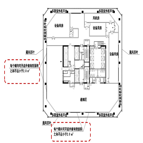 問題:采用自然通風方式防煙的避難層中的避難區僅在一個朝向設置可開啟外窗;有效面積小于避難區地面面積的2%,或在不同朝向設置外窗時,未同時考慮總有效面積不小于地面面積的2%與每個朝向的面積不小于2㎡,導致朝向開啟面積不足。