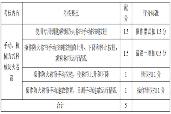 考核內(nèi)容防火卷簾的手動操作方法。考核標準1.正確操作手動控制按鈕,查看防火卷簾動作情況; 2.正確操作手動拉鏈,查看防火卷簾動作情況; 3.正確操作手動速放裝置,查看防火卷簾動作情況。 考核方式模擬操作或現(xiàn)場操作。配分與評分標準