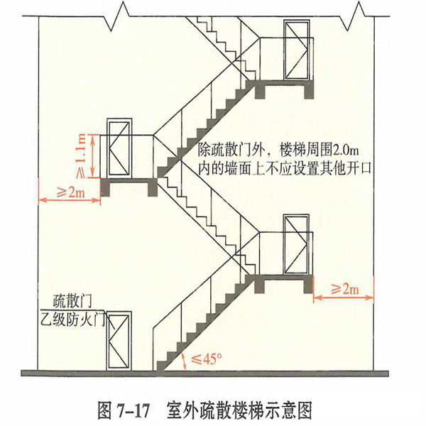 7.1.11-3 除疏散門外,樓梯周圍2.0m內(nèi)的墻面上不應(yīng)設(shè)置其他開口,疏散門不應(yīng)正對梯段。